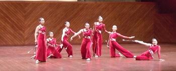 本校生徒6名と中央高校生徒1名、計7名が緋色の衣装に身を包み、情熱的でアップテンポな「クリムゾンダンサー」の曲に合わせ、ステージいっぱい演技を披露しました。