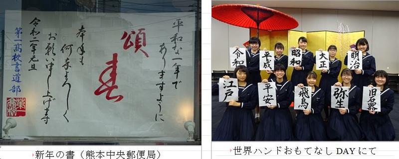 令和2年を迎え、今年も新年の書を熊本中央郵便局に飾っていただきました。また、1月9日(木)熊本県民テレビの「てれビタ」(16:50~)に本校書道部が出演しますので、ぜひご覧ください。