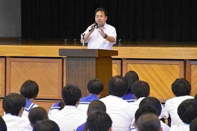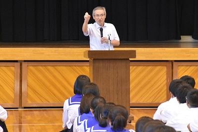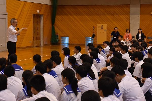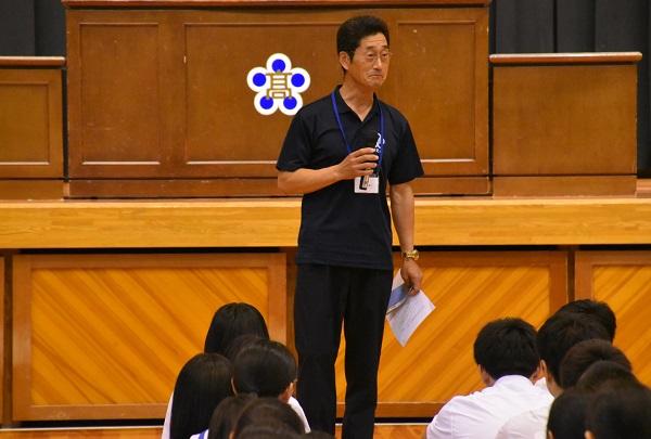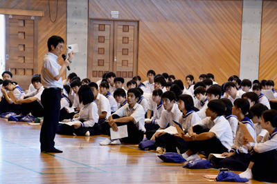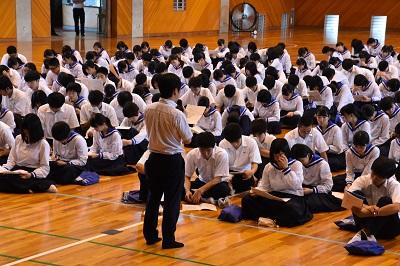 9月4日(水)7限目に体育館で、3年生に対して井上進路指導主事から、来年1月18日(土)・19日(日)に実施される大学入試センター試験の志願票作成について説明がありました。3年生は135日後に迫ったセンター試験に向けて、緊張感を持って説明を聞いていました。また、進路部の辻先生から10月開始のⅡ期課外授業、吉村先生から小論文講演会について説明がありました。