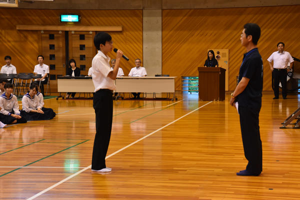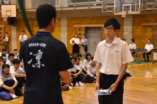 本校PTAの好文会から3年生に対して、校長先生の檄文が封入されたマークシート記入用の鉛筆や消しゴムのセットが合格応援として贈呈されました。深水校長先生や伊藤好文会会長の激励の言葉に対して、生徒代表として9組の中島君がお礼の言葉を述べました。