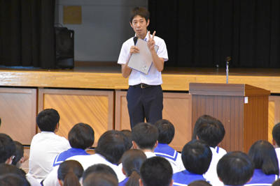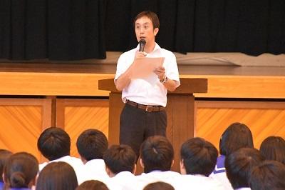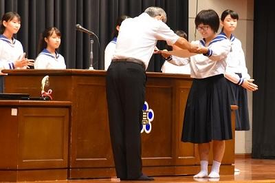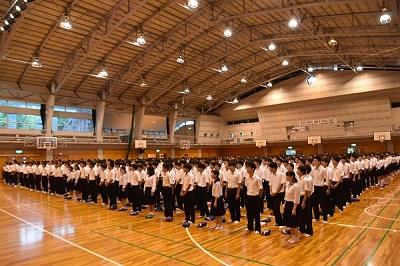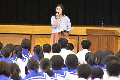 8月27日、令和元年度第2学期が始まりました。ALTのアナベル・シュウ先生の新任式や表彰式、始業式が行われました。