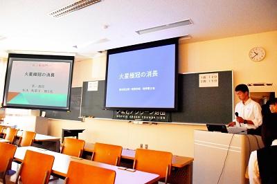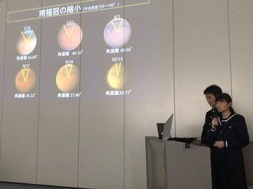 12月14・15日に宮崎公立大学で、九州高等学校生徒理科研究発表大会が開催されました。地学部の「火星極冠の消長~極冠消長から解る火星大気の循環とダストストームの影響~」の研究発表が、地学部門で最優秀賞を受賞しました。審査委員長の宮崎大学工学教育研究部の山内 誠 教授から、地学部門や本校の研究発表について以下の講評をいただきました。「各校の地学部等は研究予算も限られ、発表は1・2年生であるので知識習得も不十分で研究環境は大変厳しいと思われる。発表する生徒の緊張感が審査委員にも感じられたが、十分に研究内容が伝わる発表であった。最優秀賞となった研究は、ほぼ完成されていると思われる内容であった。研究の結果や考察などの考え方を伝えるスライドの作り方やプレゼンテーションが上手く、非常に解りやすい発表であった。」