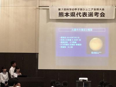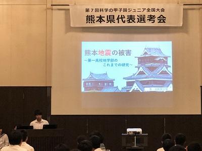 令和元年7月31日(水)にホテル熊本テルサで、熊本県教育委員会主催の第7回科学の甲子園ジュニア全国大会熊本県代表選考会が開催されました。地学部は選考会に参加した中学生に、「熊本地震の被害~第一高校地学部のこれまでの研究~」と「火星極冠の消長」について講演(研究発表)を行いました。2016年熊本地震発生から続けてきた、熊本地震の被害と地形や地質等との関係、防災意識等についての研究をまとめて発表しました。また、昨年地球に大接近した火星の南北両極冠の消長について、極冠の面積変化と南極北極が受ける太陽放射エネルギー量や火星の大気圧等との関係を発表しました。選考会に参加した県内中学生約70人に、約1時間の講演(研究発表)を行い、中学生から「研究を進める中で出てきた新たな課題について、さらに研究を進めて内容を掘り下げる研究のやり方は、自分たちが研究を進めていく上で参考になりました。」と感想が述べられました。