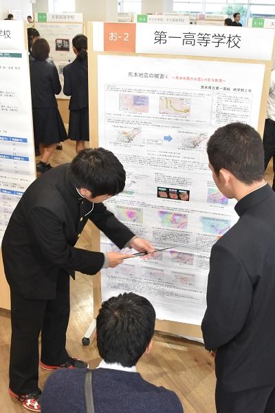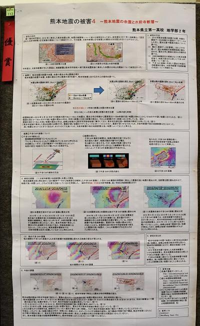10月20日(日)に崇城大学薬学部で、第70回熊本県高等学校生徒理科研究発表会が開催され、物化生地各部門に合計50件の研究発表がありました。地学部門では2年生が部活動部門で2件、1年生がサイエンスセミナー部門で1件の研究を発表しました。このうち2年生の「火星極冠の消長」の研究発表が最優秀賞となり、12月に宮崎県で開催される九州高等学校生徒理科研究発表大会での発表が決まりました。また、2年生の「熊本地震の被害4~熊本地震の余震と水前寺断層~」が優秀賞、1年生の「地球観測衛星のデータを利用した阿蘇における崩壊箇所の抽出」が1位部会長賞を受賞しました。