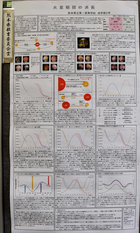 日本学生科学賞熊本県審査で最優秀賞となり、中央予備審査に出品した「火星極冠の消長~極冠消長から解る大気循環とダストストームの影響~」の論文はこちら。→HG16 ・熊本県立第一高等学校.pdf