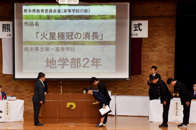 科学に関する興味・関心を喚起し、科学する心を育成することや科学的なものの見方、考え方、問題のとらえ方、処理の方法等について具体的な啓発の機会とすることを目的に、79回目となる科学展が開催されました。地学部は3件の研究物を出品し、2年生の「火星極冠の消長」が熊本県教育委員会賞を受賞しました。他の2件もそれぞれ優賞を受賞しました。展示会は11月1日~11月12日まで熊本市東区の熊本市環境総合センターで一般公開され、表彰式が13日に熊本県庁地下大会議室で開催されました。