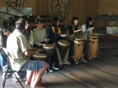 音楽の授業では、子どもたちと歌をうたったり、ドラムをたたいたりしました。