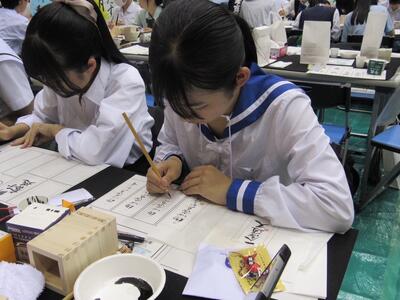 また、8月6日には宇土市で行われました「書道作品制作講習会」に参加してきました。熊本県の各校の書道部員が2日に分かれて、合同で作品を制作したり、他校の先生方に指導を受けたりしました。普段は他校の書道部の生徒と合同で活動することはありませんので、非常に貴重な機会となりました。他校生の書を制作する様子に刺激を受け、9月に行われる揮毫大会への意欲を高めることができました。