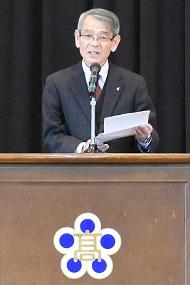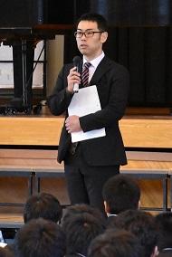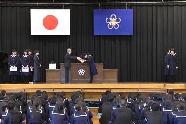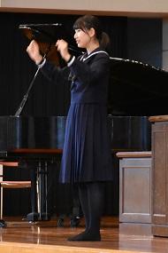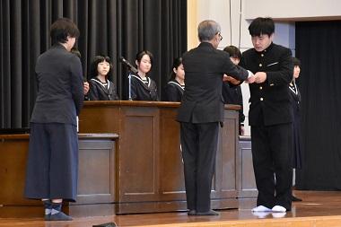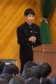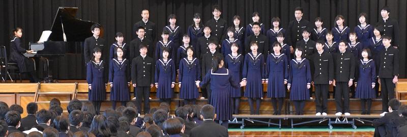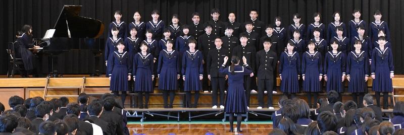 音楽部部長の指揮による校歌斉唱や生徒会保健委員会環境係のペットボトルのふた回収運動結果報告、進路指導主事の講話等があり、校内合唱コンクール最優秀賞の1年7組と2年1組の合唱が披露されました。