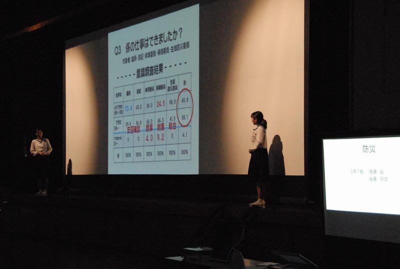 「生徒目線の防災活動 ~今私たちにできることは~」と題し、生徒防災委員会による発表が行われました。