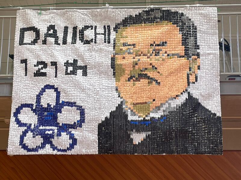 一高祭文化部門のシンボルの一つである全校制作として今年度は、全校生徒が作り上げた1万2千羽の折り鶴を用いたモザイクアートにチャレンジしました。