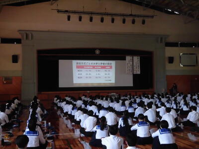 2年生と同じ時間帯に、1年生は体育館で2名の講師による進路講演会がありました。北九州予備校の講師の方からは、入試を見据えて1年生のうちから意識を高く学習に取り組むことの大切さ、京都大学総合人間学部の先生からは、AIとの共生による創作文化の発展について深めていただきました。