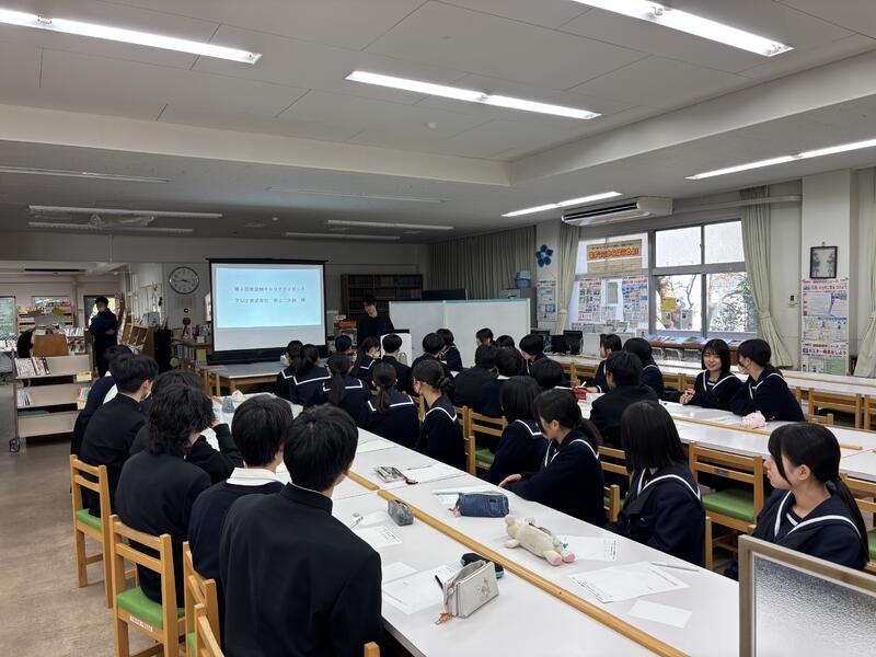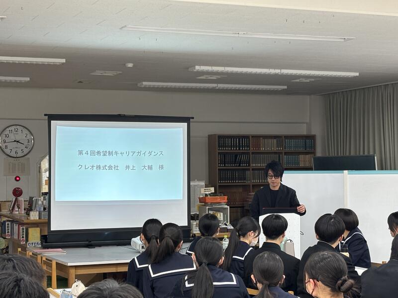 第一高校では、年間5回、希望者を対象に職業人による講話(キャリアガイダンス)を開催しています。今回、第4回目を実施し、クレオ株式会社の井上大輔様をお招きし、起業・経営についてご講演いただきました。井上様は、サクラマチや下通りなど県内にカフェを7店舗経営されており、カフェを経営することに至った経緯や経営するうえで大切にされていることを熱く語っていただきました。そのなかで、「友達」と「仲間」の違いに触れ、共通の目的や利害を共有することで結ばれた「仲間探し」を大切にして欲しい、そして、そんな仲間と大きな夢や目標を抱き、たとえ失敗したとしてもチャレンジし続けることが成功のカギであると伝えられていました。生徒は、配布された小さな紙に各々の夢を書き記し、それを自身の財布や筆箱に入れ、その夢が叶うまで努力し続けようと誓いを立てていました。生徒は、「井上さんの「無理と言われる方がワクワクする」という考え方は自分とは大違いでこんな人になりたいと思いました」、「夢は大きく、夢に向かって全力で努力できる人になれるように頑張ります」という感想を述べており、大変有意義な時間となったようです。