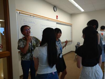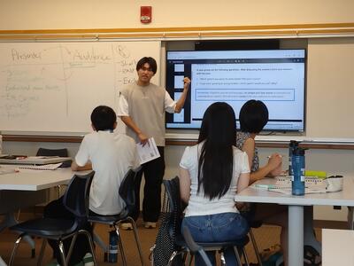 テキストにある2つのスピーチ原稿を比較し、どちらが分かりやすいか、それは何故だと思うかを発表しました。何と辻先生も発表しました。