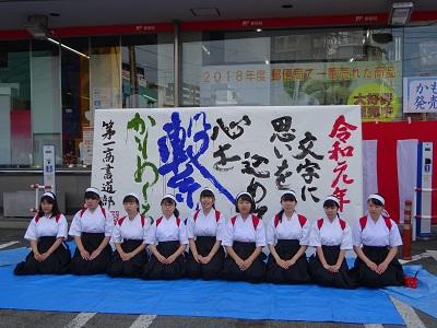 【書道部】中央郵便局記念イベントパフォーマンス 投稿日時 : 2019/06/07 学校サイト管理者 5月30日(木)、令和初の「かもめ~る」発売を記念したイベントが中央郵便局で行われ、 第一高校書道部が書道パフォーマンスを披露しました。 立てかけたパネルに揮毫するのは、思いの外難しかったですが音楽に乗せて仕上げることができました。