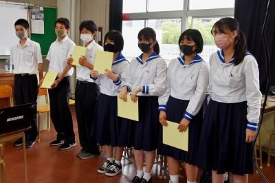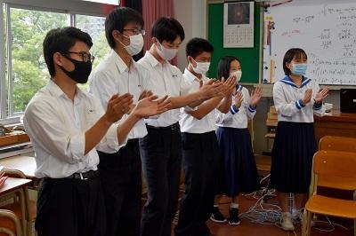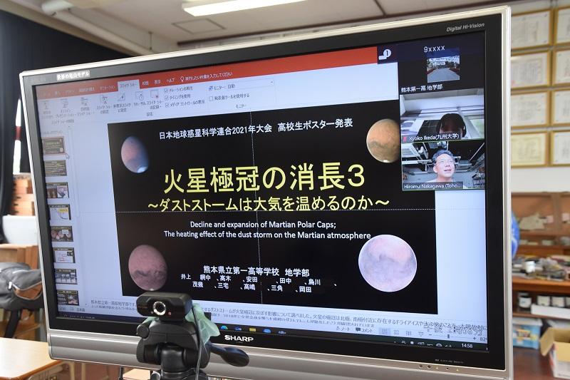 地学部はこの大会で「火星極冠の消長3~ダストストームは大気を温めるのか~」について、オンラインポスター発表を行いました。昨年度の研究に新たに実験を加え、ダストの成分について考察を深めた内容です。発表は東京大学や東北大学、九州大学等の研究者、大学院生等に見て頂き、3年生は研究者の質問に的確に回答することができました。その結果「アナログの実験による研究だが、レベルが高い。」「非常に興味深く、おもしろい研究である。」と興味を持って頂き、多くの助言を頂きました。5月末の熊本県高等学校総合文化祭展示部門で発表予定だったポスターセッションがコロナ禍で中止となり、3年生はこの研究発表をもって卒部です。後輩達から感謝と今後の発展を願って色紙が贈られました。