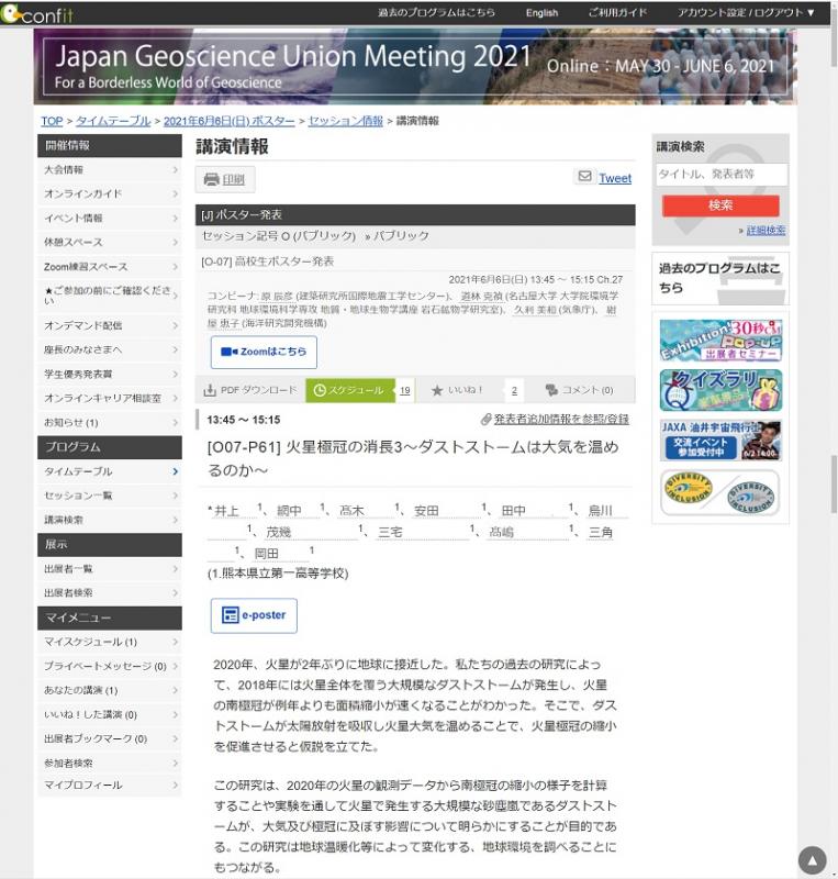 日本地球惑星科学連合(JpGU)の2021年大会が、5月30日(日)~6月6日(日)にオンラインで開催されました。日本地球惑星科学連合とは、日本の地球科学及び惑星科学領域等の地球惑星科学を構成する、すべての分野及び関連分野をカバーする研究者・教育関係者・学生等からなる学術団体です。新型コロナウイルス感染症の地球規模での流行により今年度の大会は、完全オンラインで開催されました。この大会の「高校生によるポスター発表」は6月6日(日)に行われ、高校生が地球惑星科学分野で行った学習・研究活動を ポスター形式で発表するセッションです。地球惑星科学分野の第一線の研究者と一緒に発表し、議論できる機会です。