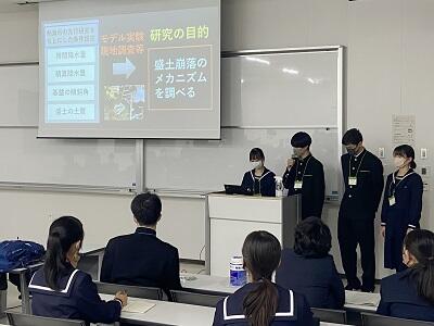 12月24・25日に鹿児島大学で、九州高等学校生徒理科研究発表大会が開催されました。地学部2年生7人は地学部門で、「盛土造成地における土砂災害の危険性」について12分間の研究発表と4分間の質疑応答を行いました。発表に対して参加した他校生徒から多くの質問がありましたが、いずれも適切に回答することができました。審査員の鹿児島大学理学部理工学域理学系理工学研究科(理学系)理学専攻物理・宇宙プログラムの中西裕之准教授は本校の発表に対して、「系統だって調べられた良い研究である。スライドのグラフ軸の数値が大きく示されており見やすい。今後も実験を続けていくことで、さらなる研究の深まりが期待できる。」と講評を頂きました。本校の発表は優良賞でした。研究発表後には桜島の巡検を行い、充実した研究会になりました。