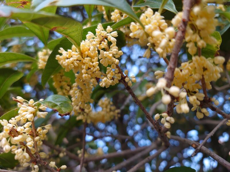 管理棟前にあるのは、ギンモクセイ。花言葉は「高潔」