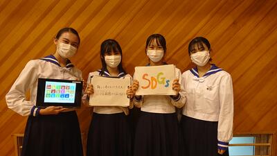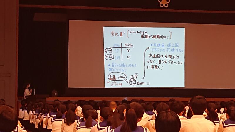 2年生の「総合的な探究の時間」に3年生4名が、募金活動やアフリカこどもの日等の校外活動を通してSDGsについて考えたことや学んだことをプレゼンしました。世界で起きていることに興味関心を持ち、そこで出会う仲間からの学びの場を2年生にも体験してほしいと訴えていました。