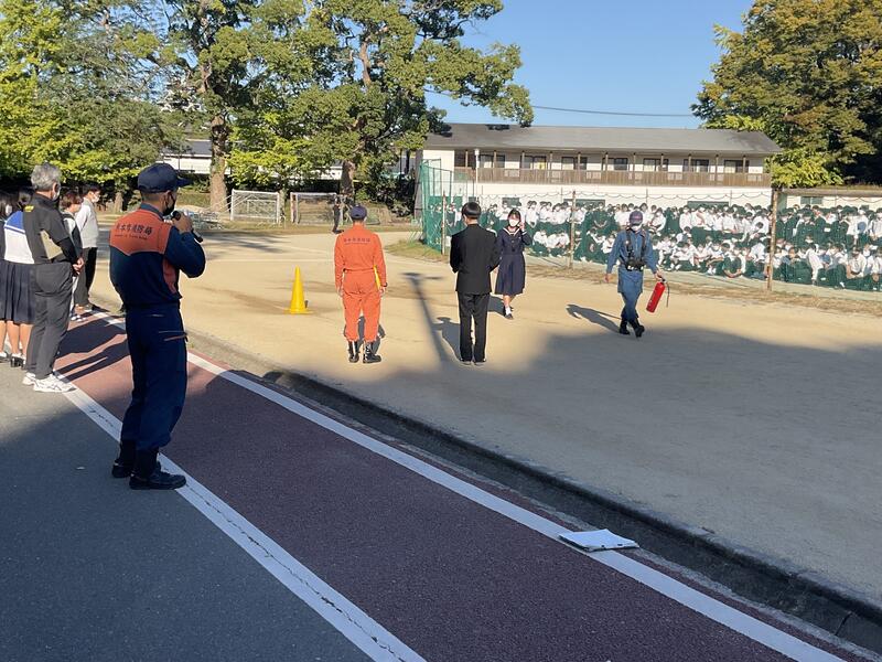 10月26日(水)防消火避難訓練を行いました。火災が発生したときにどのように行動したらいいのか考え、避難経路もその場で判断し、全校生徒が避難場所であるグラウンドに集合しました。その後、西消防署の方の講話や、消火器の使い方を教えていただきました。