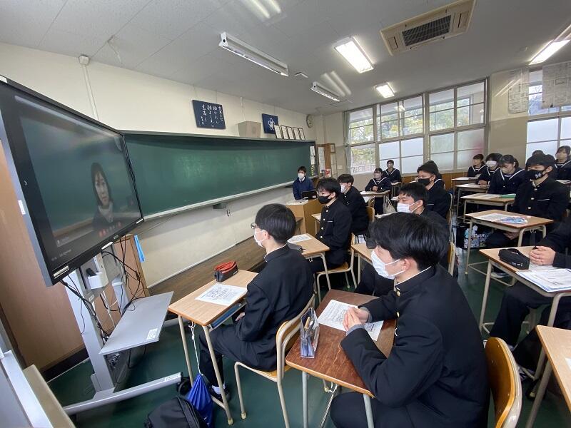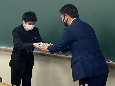 1月13日の令和5年度大学入学共通テスト前日に、3年生共通テスト前日激励会および合格祈願品贈呈式が開催されました。コロナやインフルエンザウィルス等感染拡大防止のため、リモートで各教室に配信されました。校長先生や進路指導主事、学年主任、養護教諭の講話等があり、本校PTAの好文会会長から生徒代表に、合格祈願品が贈られました。本校共通テスト受験生、がんばれ!!