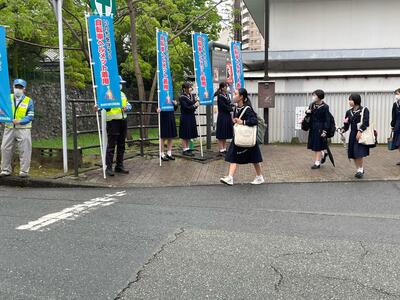 令和6年4月15日(月)早朝、本校正門及び東門付近において、標記企画が行われ、本校生徒会役員15名が参加しました。