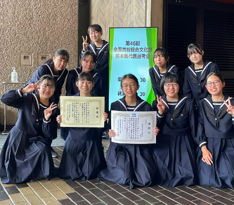 私たち邦楽部は、令和4年7月16日に行われた第47回熊本県高等学校器楽コンクール(日本音楽部門)の合奏で金賞を受賞しました。3年生が引退し、1年生と2年生の新チームになってから初めての大会だったので緊張しましたが、金賞を受賞でき大変嬉しく思っています。特に1年生は全員初心者で、4月に練習を始めてから金賞を受賞できるほど上達しました。私たちは「心を一つに」を大切に演奏しています。次は文化祭に向けて初音ミクの「千本桜」を格好良く演奏できるように頑張ります!