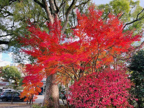 正門横の「途上の道」付近の樹木が見事に紅葉しているのを発見しました。