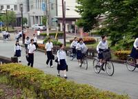 登校します。市内中心部にある本校は、交通アクセスもバッチリ。 桜町バスターミナルから歩いてくる生徒、 市電で通ってくる生徒、自転車の生徒も多いです。 車の通りも多いので、交通マナーにはしっかり気を付けましょう。 |