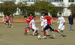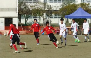 11月9日(日)の野球交流戦に引き続き、第1回サッカー交流戦が16日(日)、第二高校サッカー場で行われました。試合に先立って、開会式が行われ、第二高校主将が選手宣誓をしました。試合前半、3点を先制されましたが、前半終了間際、今井主将のフリーキックが第二ゴールキーパーのパンチングをかわしてゴール!、1対3で前半終了。後半は得点チャンスが何度もありましたが、得点することができず、1対4で敗れました。閉会式では、勝利した第二高校チームにカップが贈られ、特別賞として本校唯一の得点を挙げた今井主将にサッカーシューズが贈られました。また、両チームには記念品としてサッカーボールが贈られました。
