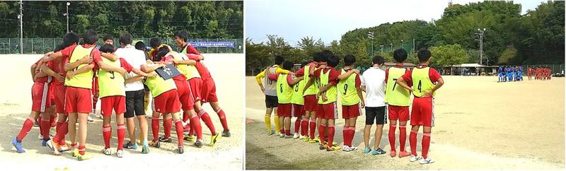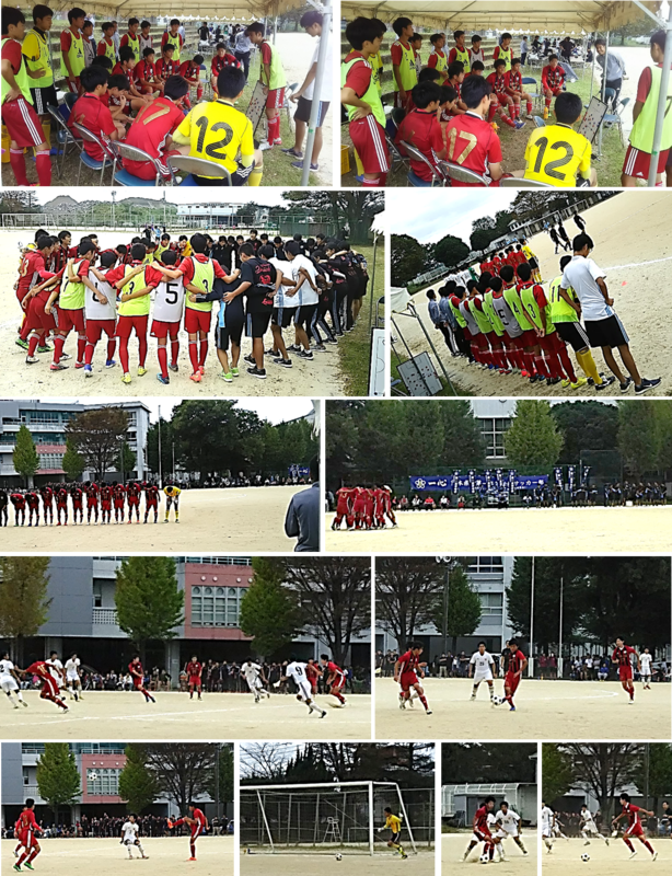 次の写真は学園大付属高校との試合です。試合前に円陣を組んで気合を高めています。この試合では惜しくも2対0で敗れてしまいましたが、第一高校は素晴らしい攻撃と守備を見せ、最後まで戦いました。3年生はこれで引退となりますが、次は受験勉強という敵に対して、部活動で作った仲間と培った絆で戦い勝ってほしいと願っております。
