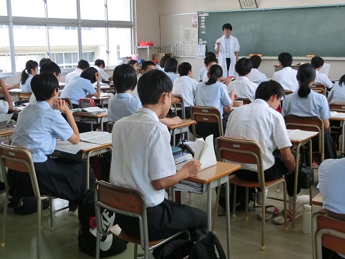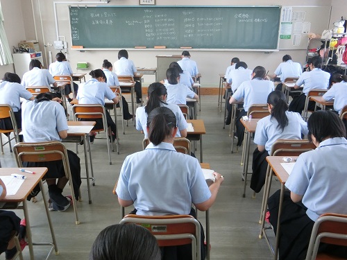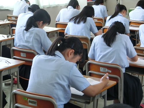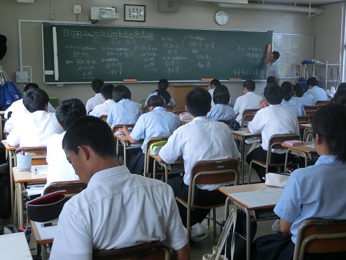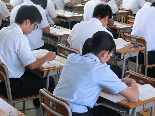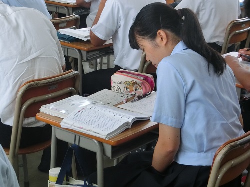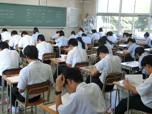 暑い中、夏休みの課外が行われています。1,2年生は国語、数学、英語の3教科、3年生は理科、地歴・公民を加えた5教科または6教科の課外の実施です。