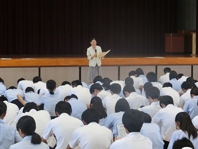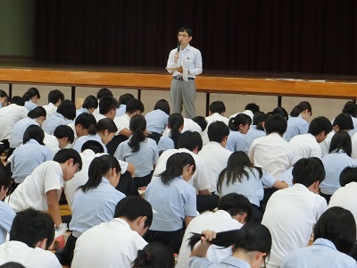 期末考査が終わって、夏休みを直前に控えた4日の午後、3年生を対象とした「小論文ガイダンス」がありました。本校国語科職員による小論文入試の傾向や対策についての話があり、蒸し暑い体育館の中で3年生は真剣に聞き入っていました。