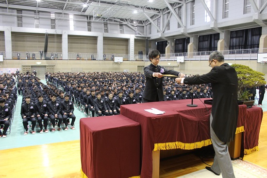 3月1日(金)第55回卒業証書授与式が挙行されました。普通科319人、理数科40人、美術科40人が母校を巣立ちました。サプライズで同窓生からの応援メッセージビデオが届けられ、最後は式典リーダーの指揮のもと三綱領唱和を行い、皆で生徒歌を歌いました。思い出に残る、感動的な卒業式となりました。