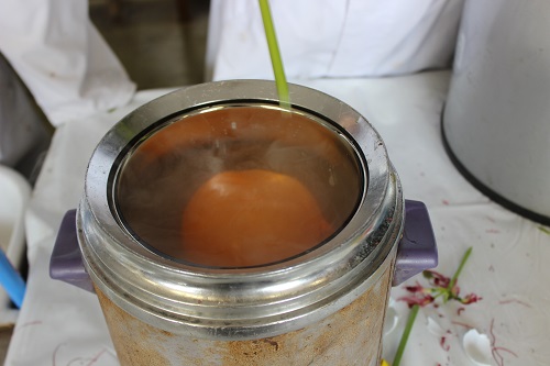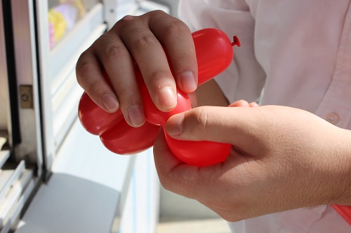 次は液体窒素による冷たい実験。この中で風船や花ががちがちに凍ってます。
