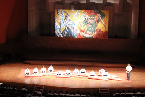◆筝楽部演奏。今年は顧問の南先生の笛を聞くこともできました。背景にある絵は美術科1年生のクラス企画ステージ装飾です。