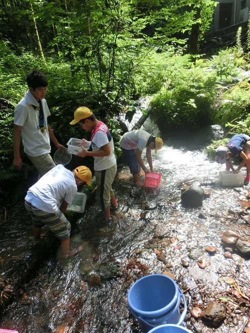 「河の子塾」は西原村教育委員会主催の活動で、西原村の山西小学校と河原小学校の4年生が参加して、地域の清流に生息する水生生物の採集を通して、故郷の自然を学ぶ学習活動です。
