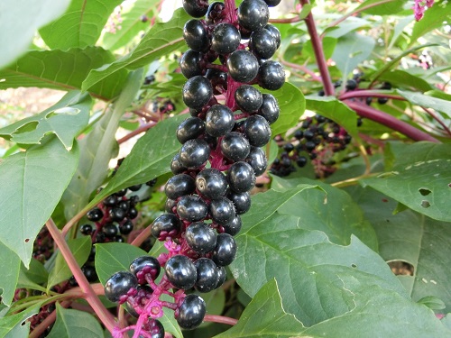 ヨウシュヤマゴボウ(学名:Phytolacca americana)は、ヤマゴボウ科ヤマゴボウ属の多年草で、別名アメリカヤマゴボウといいます。この植物の特徴と言えば、何といっても濃紫色の果実でしょう。真夏に白色または薄紅色の花を咲かせ、この時期果実は黒く熟します。潰すと赤紫色の果汁が出てきて、染料として用いられることもあるようです。皮膚や服に付くと色が落ちないので、アメリカではインクベリー(inkberry)とも呼ばれているようです。