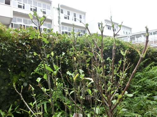 生物準備室前に濃い青色のアジサイ(Hydrangea macrophylla)が開花しました。第二高校のアジサイはガクアジサイのようです。アジサイと言えば、梅雨の花のイメージがあります。もうすぐ梅雨入りでしょうか。