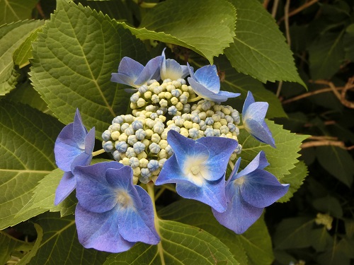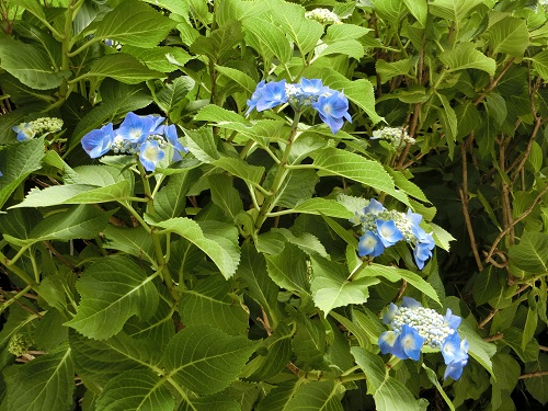 生物準備室前に濃い青色のアジサイ(Hydrangea macrophylla)が開花しました。第二高校のアジサイはガクアジサイのようです。アジサイと言えば、梅雨の花のイメージがあります。もうすぐ梅雨入りでしょうか。