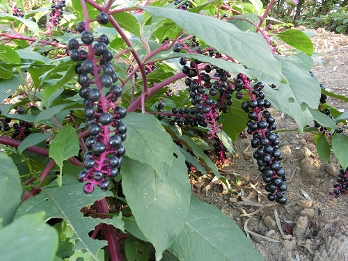 ヨウシュヤマゴボウ(学名:Phytolacca americana)は、ヤマゴボウ科ヤマゴボウ属の多年草で、別名アメリカヤマゴボウといいます。この植物の特徴と言えば、何といっても濃紫色の果実でしょう。真夏に白色または薄紅色の花を咲かせ、この時期果実は黒く熟します。潰すと赤紫色の果汁が出てきて、染料として用いられることもあるようです。皮膚や服に付くと色が落ちないので、アメリカではインクベリー(inkberry)とも呼ばれているようです。