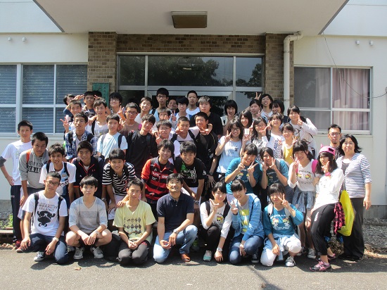講師の新垣先生と一緒に集合写真 九州大学臨海実験所にて