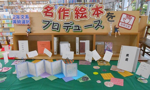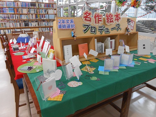 2年文系美術選択者が、美術の授業で制作した絵本を、参考にした本と一緒に展示しています。絵本といっても、巻物だったり、立体だったり、1枚の大きな作品だったり、創意工夫して作り上げた力作ぞろいです。表紙がちょっと味気なくても、絵本をひらくと思わず見入る作品ばかり。