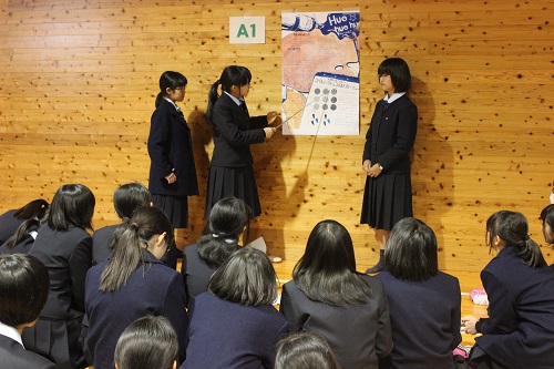 今回の発表会はA3用紙に記入したものを実物投影機で拡大しています。ICTの活用も第二高校の研究テーマです。