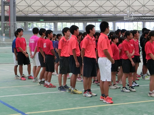 テニス部の1,2年生は午前中、総合開会式に参加し、元気に行進しました。初めて参加した1年生は人の多さに驚いたようでした。午後からは男子が運動公園ABコートで、女子はパークドーム熊本で個人戦のダブルスがあり、開会式に参加した1,2年生も駆けつけて厚い中、一生懸命に応援しました。