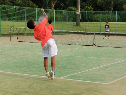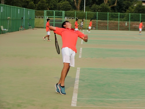 1年生の初心者はストロークやサーブに難がありましたが、「テニスのルールと試合の進行を知る」という目標で試合を行いました。一方、2,3年生と1年の経験者は、本番さながらのマッチ練習を行いました。特に、今週末に高校総体に出場する選手は基本の確認、また積極的なネットプレーを意識した動きが見られました。途中、熊本高校の選手と練習試合を行うことができ、有意義な練習となりました。