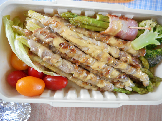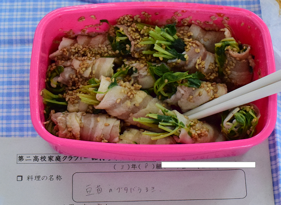 • 期末テストが終わり、課外が始まって疲れている人が多いと思ったので、豚肉のアスパラ巻きを作りました。豚肉にはビタミンB1が含まれていて、アスパラガスにはアスパラギン酸が含まれています。二つとも疲労回復効果があると聞いて、クラスのみんなにぴったりだと思いました。最後の一品持ち寄り弁当、楽しくていい思い出になりました。