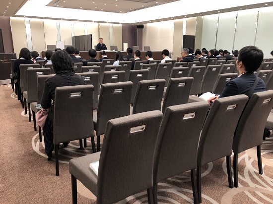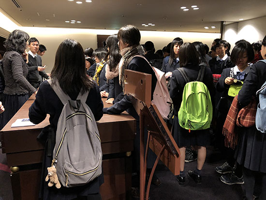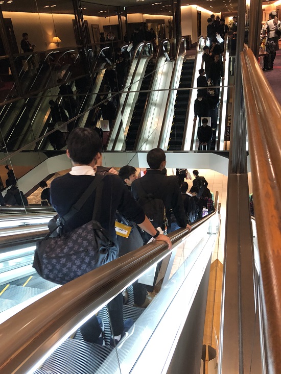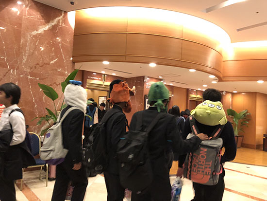 3日目の宿、新宿シティホテルに着き、夕食を待っている生徒たち。