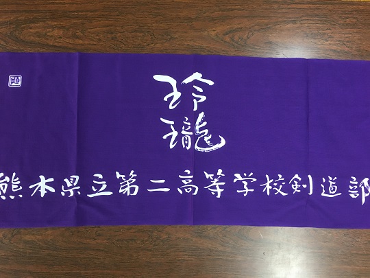 剣道部の新しい面タオルが完成しました。作成にあたり、剣道部OB会の方々に相談し、揮毫をOB保護者の松永様に依頼しました。文字は校歌2番にあります「玲瓏」です。色はもちろん竜胆色。部員たちには、来月の新人戦をこの面タオルで、まさしく「玲瓏」の如く活躍できるよう奮起して欲しいです。